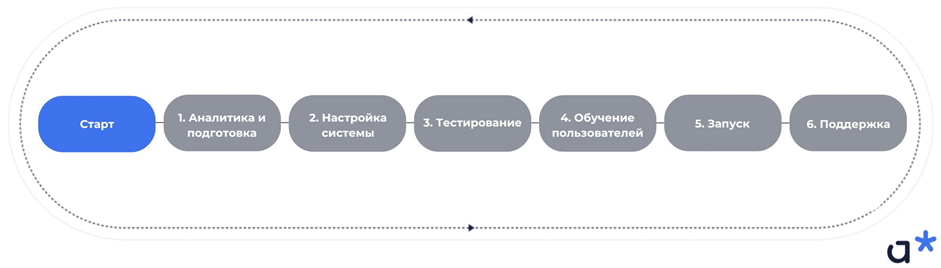 ✔️ работы по внедрению: аналитика, настройка и доработка системы, тестирование, обучение сотрудников);